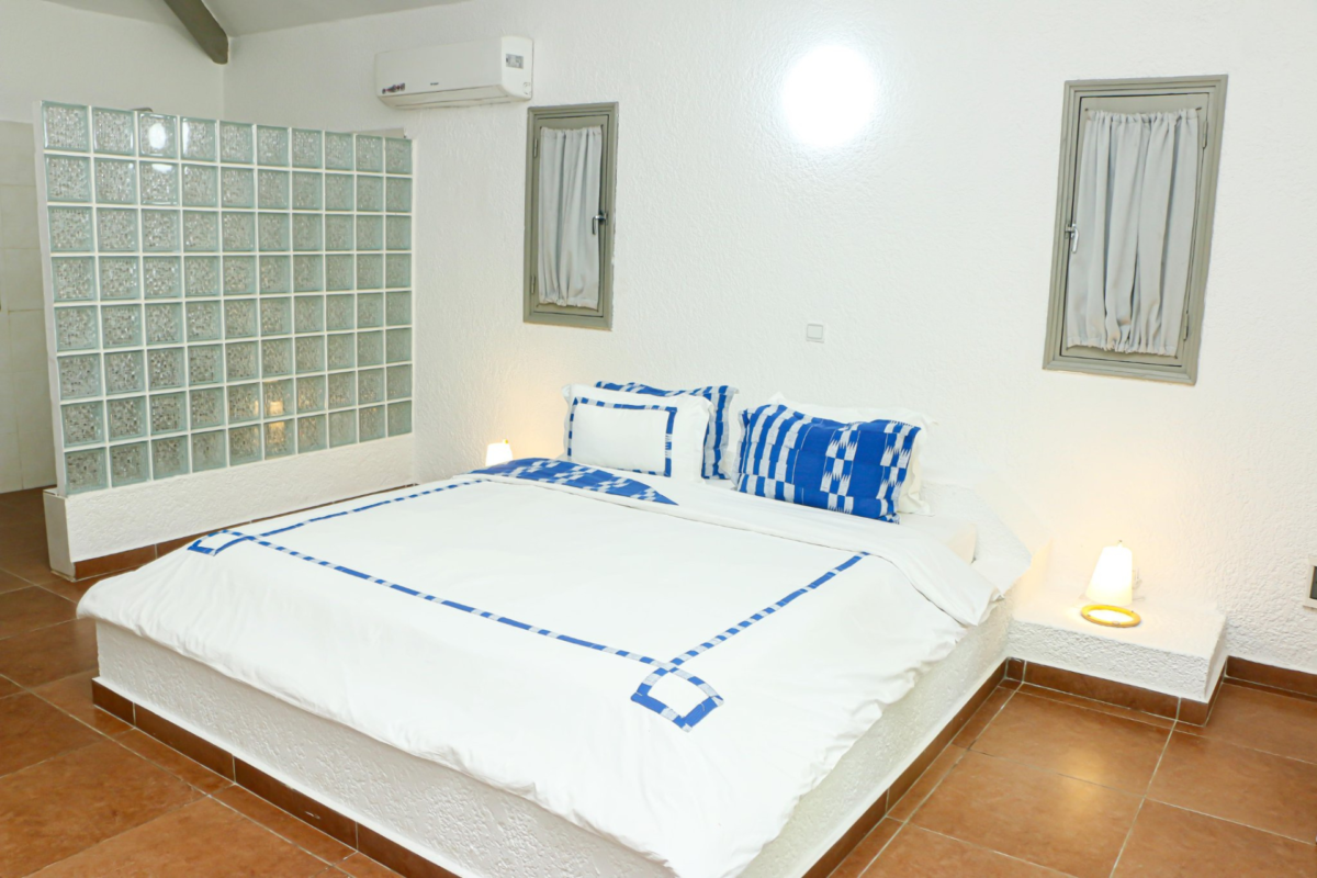 La Chambre 4, située face au jardin, est un véritable havre de paix au sein de Notevia Hôtel Assinie. Offrant une vue agréable sur les espaces verts de l’hôtel, elle séduit par son atmosphère calme et reposante, idéale pour un séjour en toute sérénité.