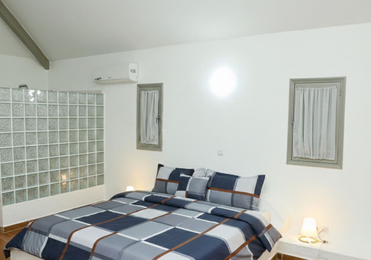 Confortablement aménagée, la chambre dispose d’une literie de qualité, d’une climatisation, d’une salle de bain privative et des équipements essentiels pour assurer votre bien-être tout au long de votre séjour. La lumière naturelle et la proximité du jardin créent une ambiance douce et apaisante, propice au repos et à la détente.
