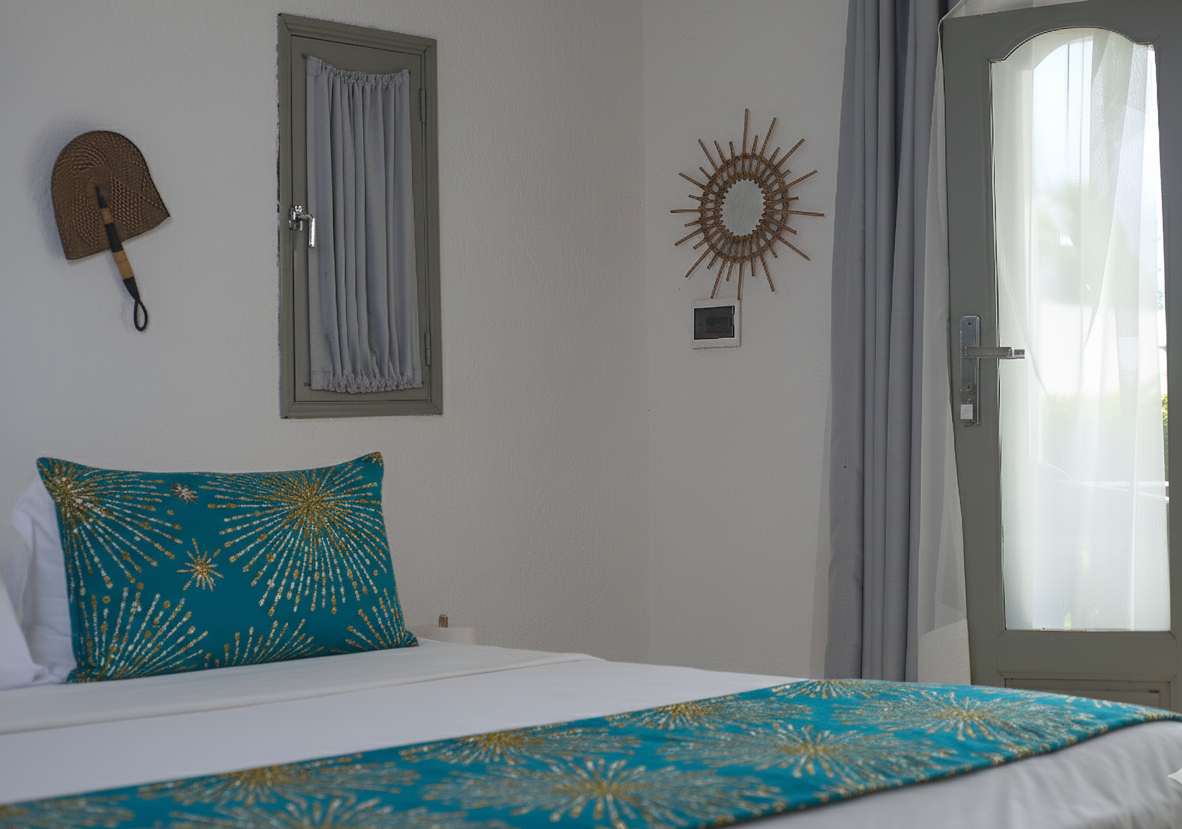La Chambre 6, située face au jardin, est un véritable havre de paix au sein de Notevia Hôtel Assinie. Offrant une vue agréable sur les espaces verts de l’hôtel, elle séduit par son atmosphère calme et reposante, idéale pour un séjour en toute sérénité.